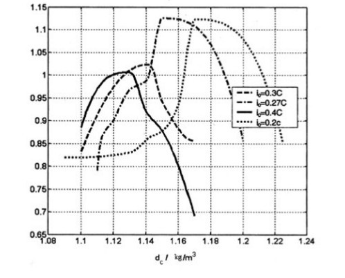 ? ? ? ??以上分析表明,成品電池充電接受能力強,其電流衰減指數大,因此快速充電的關鍵是提高電流衰減指數。由式(2)分析,任意時刻的電流衰減指數取決于充電電流與待充入的容量之比。當初始待充入容量Cr,一定時(初始電解液密度相同),電池:越大(即充電接受能力越強),允許初始充電電流越大;反之,當電池性能變差時,充電接受能力變差,電池α變小,其允許的初始充電電流越小。對于充電接受能力相同的電池,待充入容量Cr,越小(即初始電解液密度越大),允許初始充電電流越小;反之,允許初始充電電流越大。根據試驗結果繪制出初始電解液密度與初始充電電流對應所得到的電流衰減指數,如圖4。試驗結果顯示: