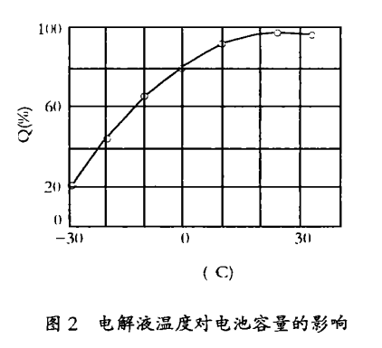 電解液的溫度升高,電解質的活動能力增強,容易形成離子狀態,得失電子就多,電池容量相對就大。電解液溫度下降,一方面引起電解液粘度增大,離子運動受到較大的阻力,擴散能力降低,向極板內部補充H2SO4速度減慢,極板深處活性物質的利用率減少使容量減少;另一方面溫度降低時,電解液的粘度增大,使電解液的電阻增大,放電中消耗的內壓降增大,使端電壓下降,放電時間縮短,容量減小。特別是低溫大電流放電對容量影響就更大。圖2所示為電解液溫度對電池容量的關系曲線。