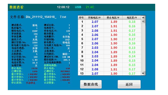 ● 放電可設定多個終止條件:放電容量到、放電時長到、單體電壓閾值 ,整組電壓閾值,其中任意一個測試條件達到后會自動停止放電,以及過電壓、過電流、過溫、數據存儲異常、電壓測試端子反接等多種測試故障報警顯示。