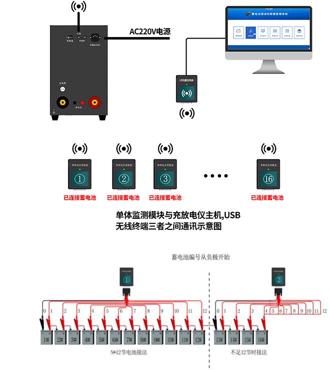 ? ● 具備無線單體采集功能:可通過放電儀實時監測各單體電壓狀況,兼容2V/4V/6V/12v單體電壓監測,單個模塊支持12只電池監測。