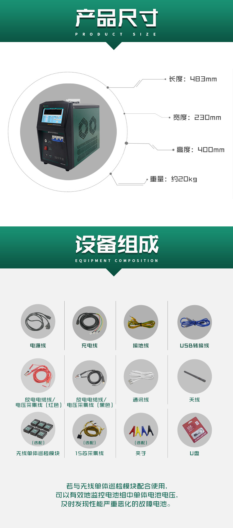 ? ● 具備無線單體采集功能:可通過放電儀實時監測各單體電壓狀況,兼容2V/4V/6V/12v單體電壓監測,單個模塊支持12只電池監測。